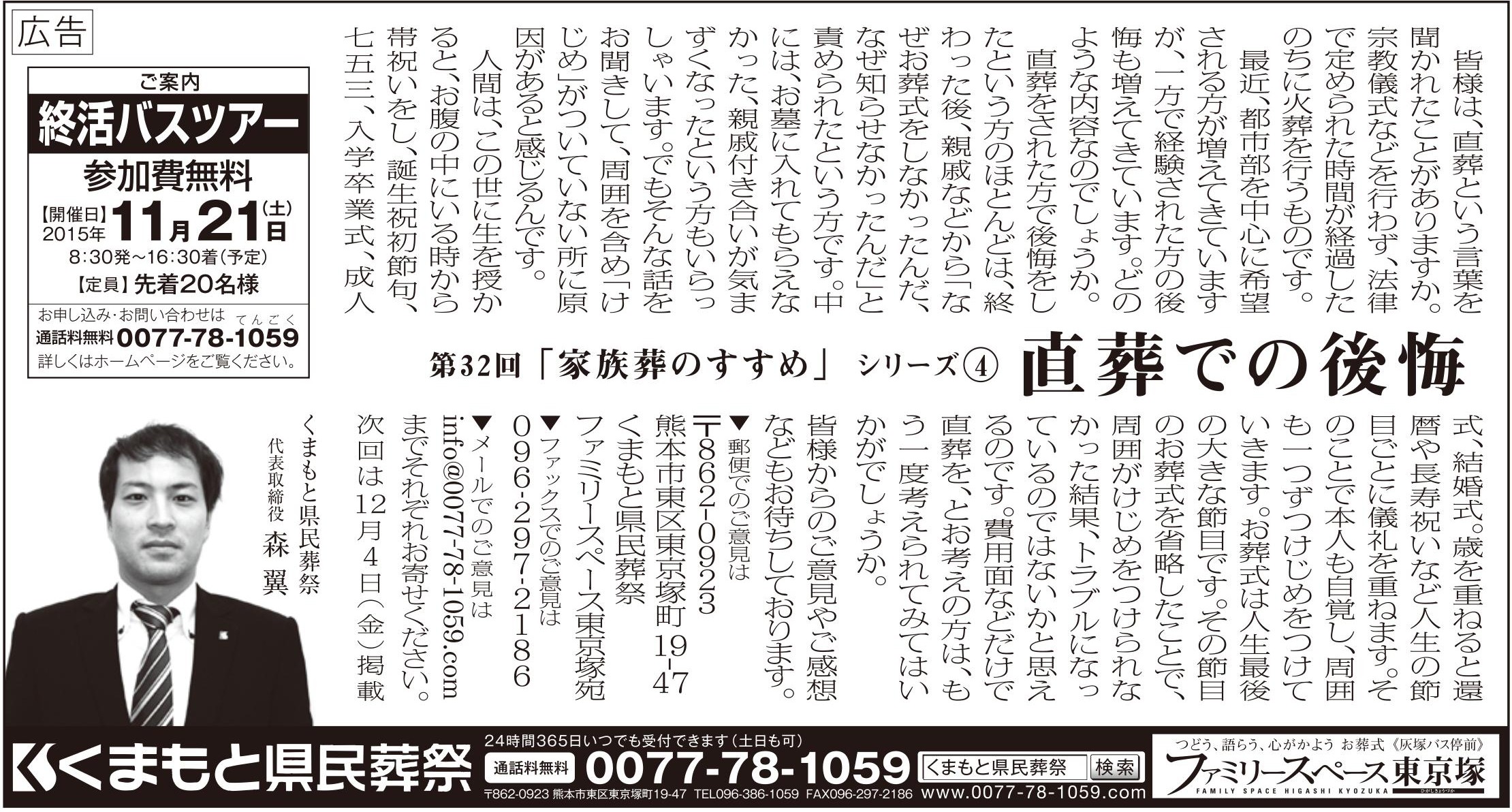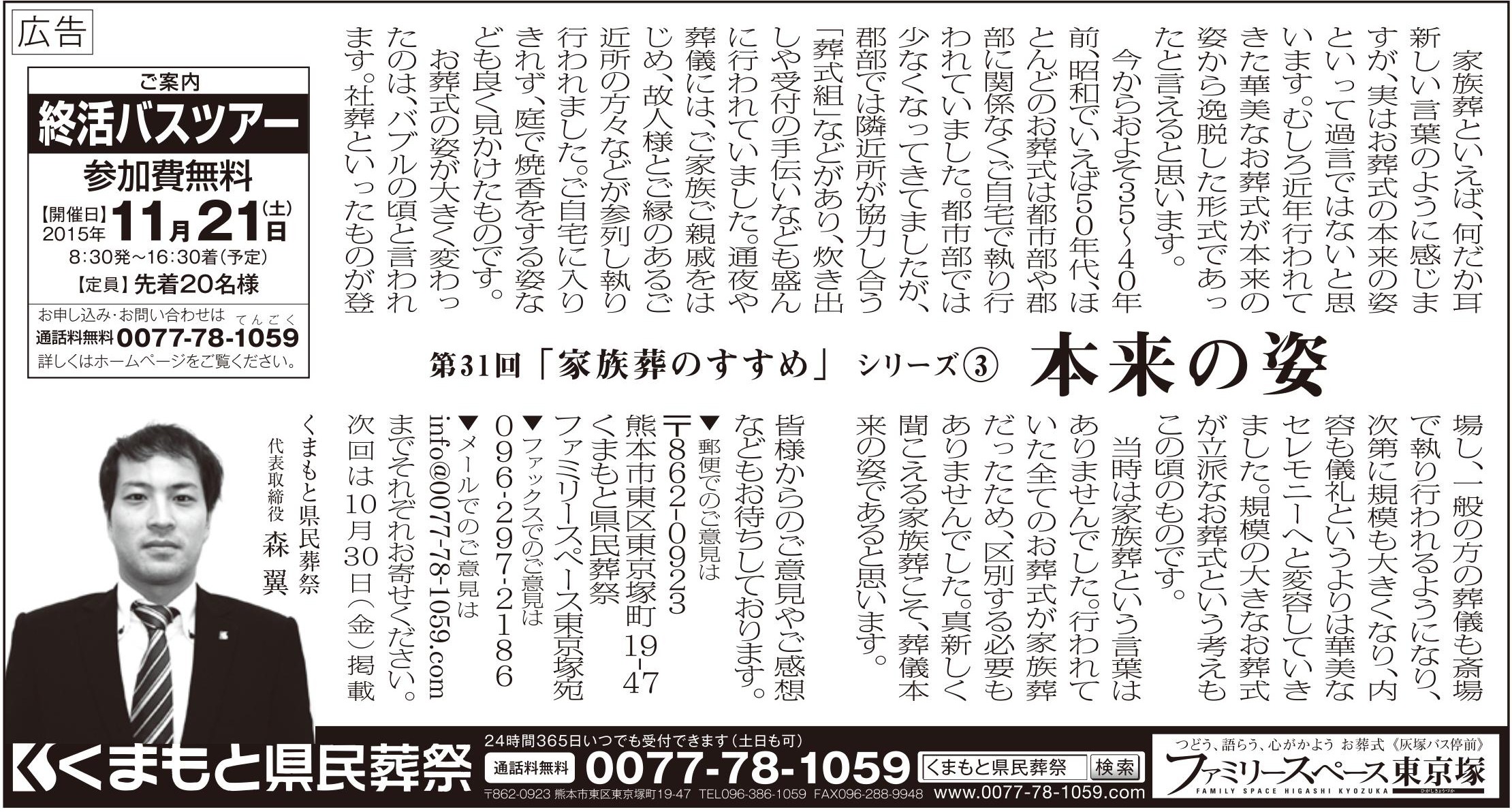 Posted in お知らせ家族葬のすすめ、新聞広告のご紹介Comments: 2015.11.23くまもと県民葬祭が掲載した、熊本日日新聞夕刊広告をご紹介します。今回のテーマは「家族葬のすすめ」。皆さんの参考にもなると思いましたので、ご紹介させていただきました。是非お読みいただければ幸いです。 掲載された記事を押して頂くと拡大してご覧いただけます。