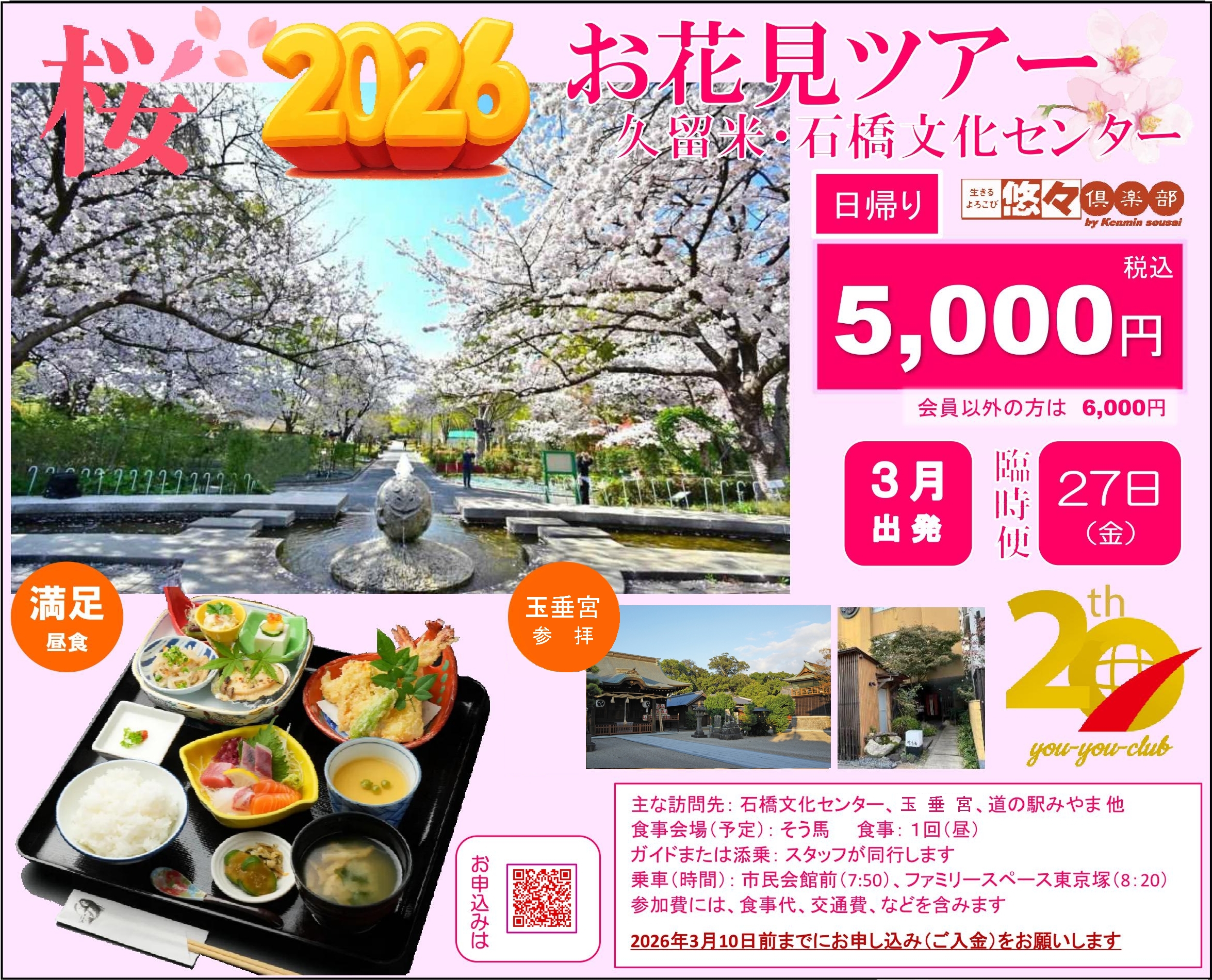 | 訪問先(予定) | 市民会館前~ファミリースペース東京塚~玉垂宮参拝~石橋文化センター~ そう馬(昼食)~道の駅みやま~市民会館前~ファミリースペース東京塚 |